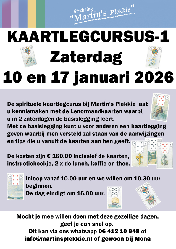 Spiritueel Centrum - Stichting 'Martin's Plekkie' bestaat uit een groepje mensen die zich bezighoudt met het verlenen van hulp aan mens en dier met behulp van spirituele energie. Wij werken allemaal vanuit een sociale overtuiging om mensen te mogen helpen om sterker en positiever in het leven te staan en dit doen we onder andere met behulp van magnetiseren. Omdat we allemaal vrijwilligers zijn en ons belangeloos inzetten, kan er met lage kosten gewerkt worden en blijft "Stichting" 'Martin's Plekkie' hopelijk voor iedere bezoeker betaalbaar en toegankelijk.